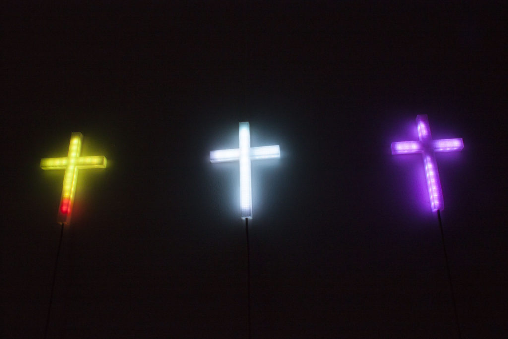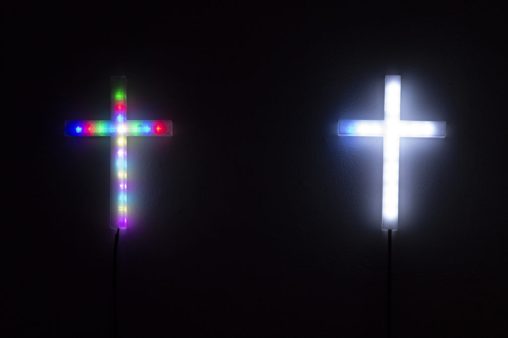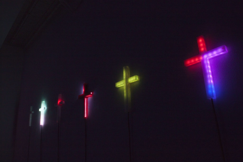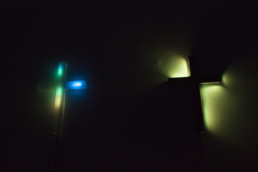 十字架にはそれぞれ個別にセンサーがついており、鑑賞者の動きを感知すると個々に十字架が光り出す。