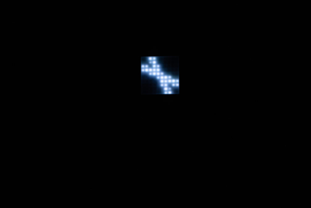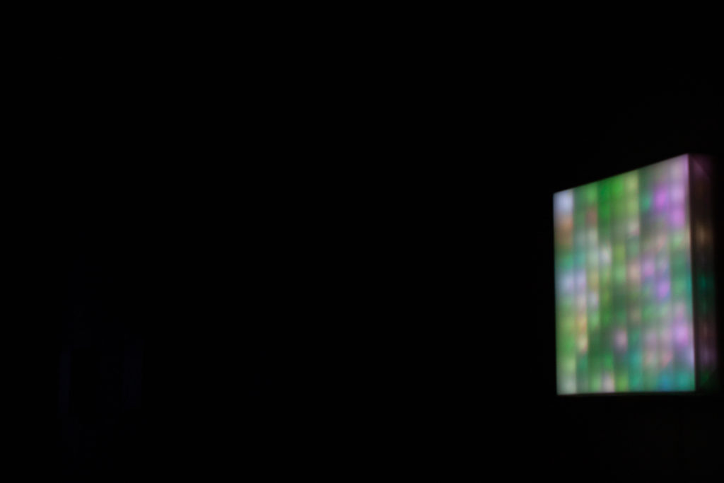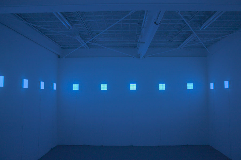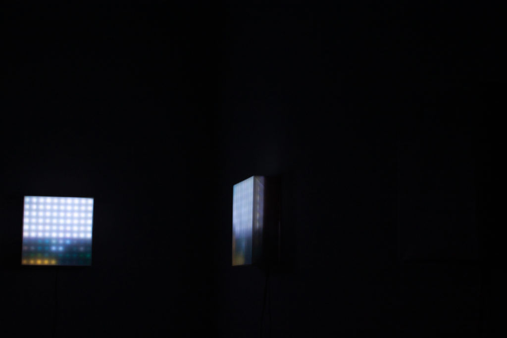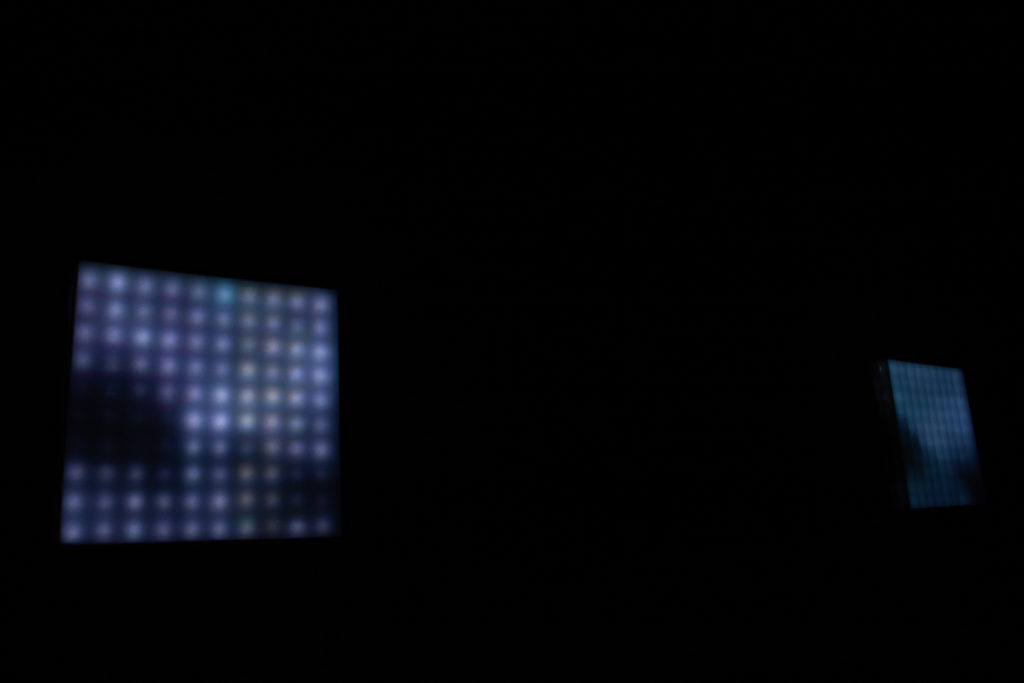 rgbLED10 x10、16.6cm x16.8cmのマトリクスのライトボックス28個が同期して動く約7分間の映像作品である。ライトボックスはギャラリーの全ての壁の少し見上げるくらいの位置に横に360°並んでいる。